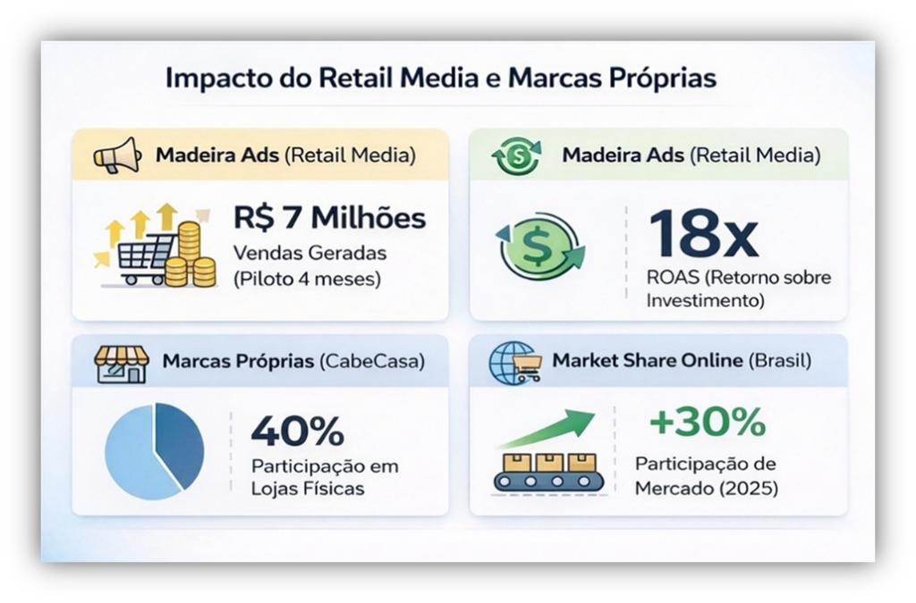 Em 2025, a empresa expandiu sua monetização através de Retail Media, criando a plataforma Madeira Ads, permitindo que os sellers do marketplace comprem espaços publicitários estratégicos dentro do ecossistema da marca para aumentar a visibilidade e as vendas de seus produtos. O diferencial é impactar o consumidor no “momento de ouro”: quando ele já está no site com intenção de compra de móveis e decoração.