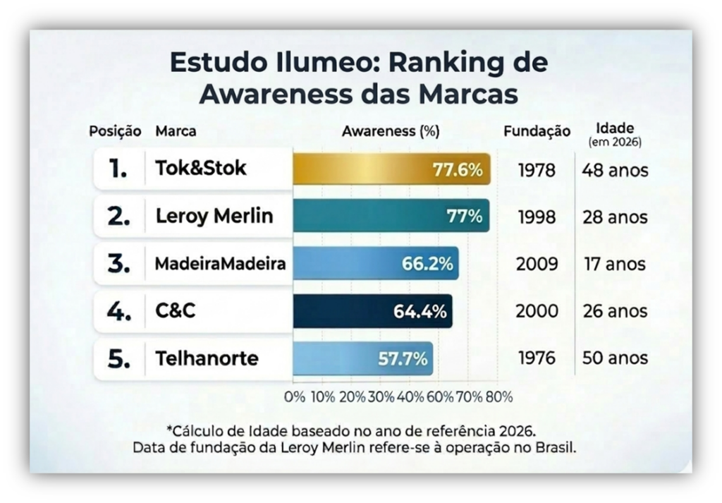 Para abordar o tema de marca, utilizaremos um estudo da Ilumeo, consultoria de Data Science fundada por professores da USP e com 15 anos de atuação no mercado. O diagnóstico foi extraído do Delfos, suíte de gestão e performance utilizada por grandes marcas nacionais. Com uma amostra de mais de 300 respondentes coletada em novembro de 2025, o estudo analisou a competitividade de marcas como MadeiraMadeira, Mobly, Tok&Stok, Leroy Merlin, Westwing e Oppa, entre outras do setor de móveis e construção.