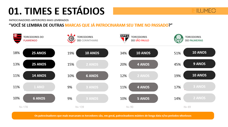 O contrato longo é o maior acerto de todos. O estudo mostra que os patrocinadores mais lembrados pelos torcedores são, invariavelmente, os de longa data: Petrobras no Flamengo, Parmalat e Crefisa no Palmeiras, LG no São Paulo. Quanto maior o tempo de patrocínio, maior a lembrança, associação com a marca e impacto. Mesmo depois que o patrocínio termina, as pessoas continuam lembrando.