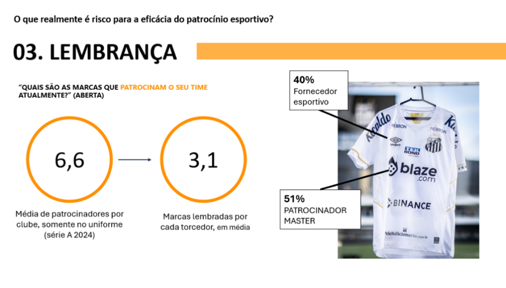 O estudo descobriu que, das 6 marcas que em média patrocinam um clube, apenas 3 são lembradas, sendo que uma é a do material esportivo (Nike, Adidas, New Balance).