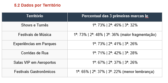 Em média, 71% dos respondentes associam pelo menos uma marca a um território de brand experience, e as pessoas lembram em média de 2 marcas. Apenas 2% dos respondentes associam um território exclusivamente a uma única marca — o que o estudo identifica como o “teto” para uma ocupação verdadeira de território.