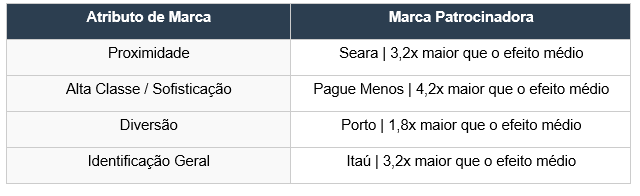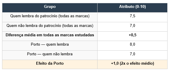 Os dados indicam que, na média geral das marcas, o impacto da lembrança do patrocínio é de 0,5 ponto (nota 7,5 para quem lembra vs. 7,0 para quem não lembra). No caso da Porto, esse diferencial sobe para 1 ponto percentual (nota 8 vs. nota 7). Esse desempenho coloca a marca com o dobro do resultado médio observado entre os demais investidores.