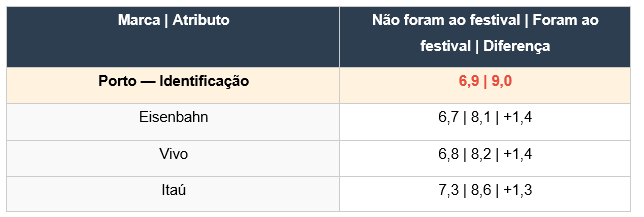 A Porto Seguros apresentou a maior diferença: +2,1 pontos em identificação entre quem foi ao festival versus quem não foi, resultado de uma ativação fortemente experiencial (montanha-russa iluminada, o Rock Station).