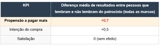 Os efeitos são estatisticamente significativos: +0,7 em propensão a pagar mais e +0,5 em intenção de compra entre quem lembra do patrocínio versus quem não lembra. O efeito é especialmente concentrado em clientes, reforçando o papel do brand experience como ferramenta de retenção e aprofundamento de relacionamento.