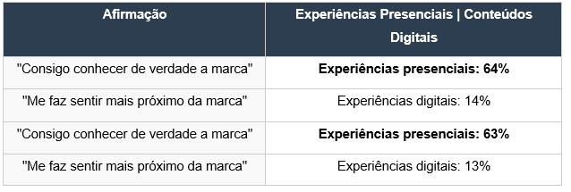 - Experiências presenciais superam conteúdos digitais em 4,5x na percepção de proximidade e conhecimento genuíno da marca.