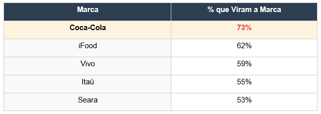 Entre os participantes do The Town, os percentuais de quem viu (reconheceu a presença) cada marca foram: