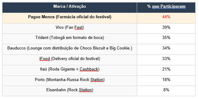 A Pague Menos liderou em participação (44%) com uma ativação altamente prática — uma farmácia dentro do festival, atendendo uma necessidade real dos participantes. Isso ilustra um princípio central do estudo: ativações que entregam algo útil geram maior engajamento.