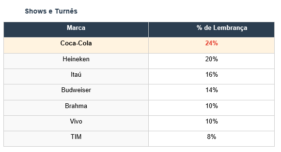 A Coca-Cola é a marca mais lembrada em festivais de música, resultado de uma estratégia de presença consistente desde 2001, como refrigerante oficial do Rock in Rio, com ativações como o Coke Studio e parcerias com The Town e Lollapalooza.
