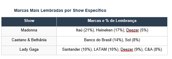 A pergunta central deste bloco foi: “Quais marcas você lembra de realizarem patrocínio?”. Os resultados revelam um padrão consistente de lembrança decrescente:
